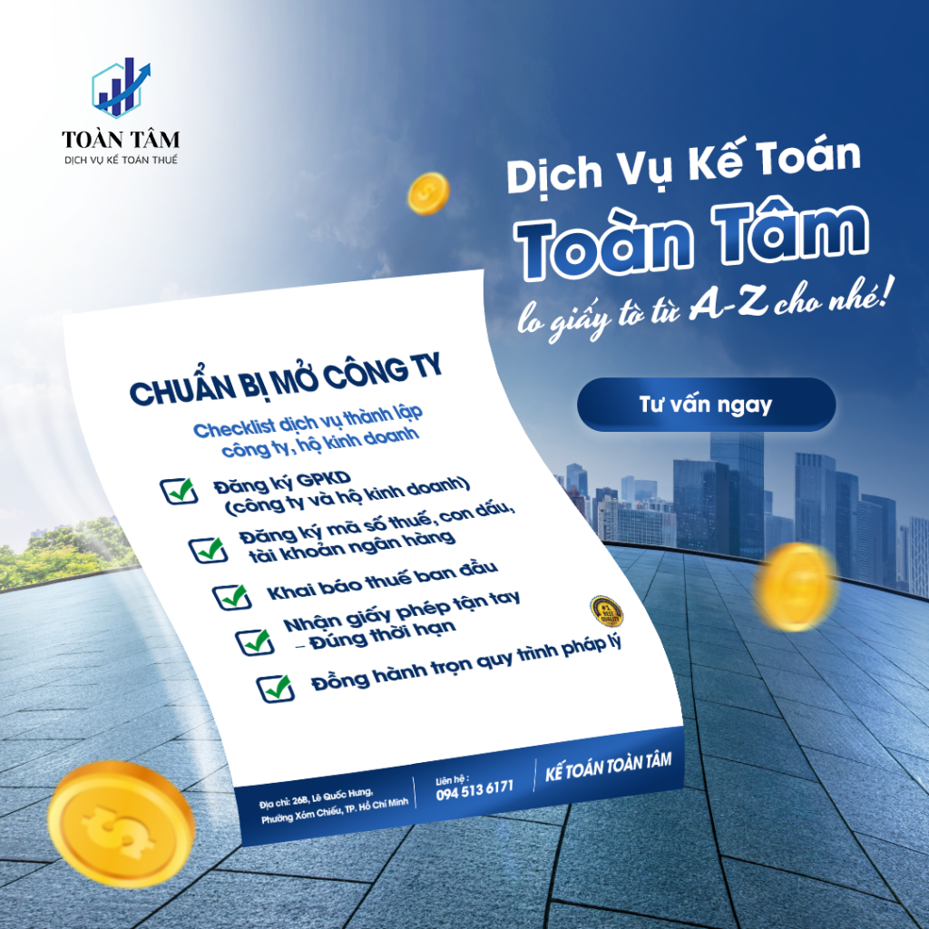 🎯 Bạn không cần lo lắng về thủ tục hay thời gian – Kế toán Toàn Tâm sẽ đồng hành cùng bạn từ A đến Z để doanh nghiệp đi vào hoạt động một cách hợp pháp và suôn sẻ nhất.